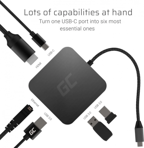 Maksimér tilslutningsmulighederne med én løsning. GREEN CELL 6‑i‑1 tilføjer alt, hvad du behøver: hurtige data via USB 3.0, stabilt netværk takket være Gigabit Ethernet, skarpt billede med HDMI op til 4K og samtidig opladning via USB‑C Power Delivery op til 87 W. Passer perfekt til ultrabooks som APPLE MacBook, DELL XPS, ASUS ZenBook, LENOVO ThinkPad og andre med USB‑C.