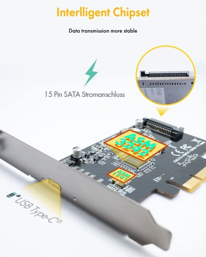 Takket være understøttelse af PCI Express 3.0 (x4) og kompatibilitet med x4/x8/x16-slots sikres en stabil og hurtig forbindelse. Integrerede blå LED‑indikatorer viser strøm og aktiv tilslutning, så du altid har overblik over enhedens status. Kortet bygger på de gennemprøvede controllere Asmedia ASM1541 og ASM3242 for maksimal kompatibilitet og ydeevne.
