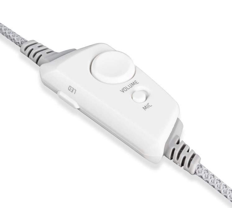 In-line controller på det flettede 2,2 m kabel gør det muligt at justere lydstyrken, slå mikrofonen fra og skifte LED-tilstande (7 farver + regnbueeffekt).