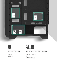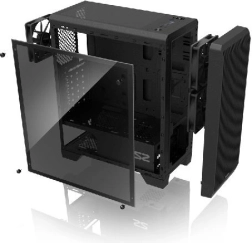 Rammeløst 4 mm glas-sidepanel fremhæver dine komponenter og RGB-elementer. Nem adgang med fire tommelskruer.