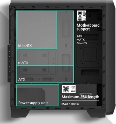 Dette moderne PC-kabinet kombinerer rent design med gennemtænkt funktionalitet. Sidepanelet i 4 mm hærdet glas giver et panoramisk kig på komponenterne, mens tommelskruer sikrer nem adgang. Takket være det rummelige interiør kan du problemfrit montere kraftige grafikkort og høje CPU-kølere.