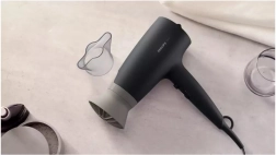 Det særlige ThermoProtect-tilbehør blander varm og kold luft, sænker temperaturen med ca. 15 °C og bevarer samtidig den hurtige tørring – ideelt til daglig pleje.