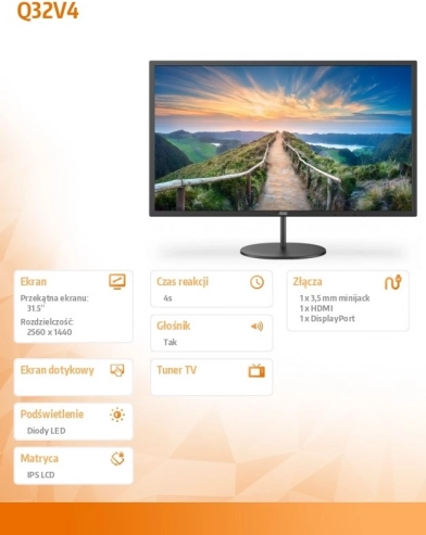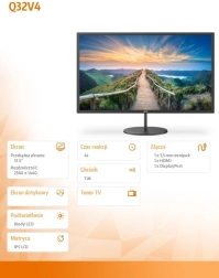 Monitor AOC Q32V4 kommer med en stor 31,5-tommers skærm der leverer en imponerende opløsning og billedkvalitet. Med IPS teknologi kan du nyde levende farver og fremragende betragtningsvinkler. Velegnet til både kontorarbejde og multimedieunderholdning.