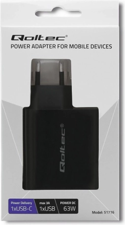 Qoltec oplader 63W med USB-C PD og USB QC 3.0, sort