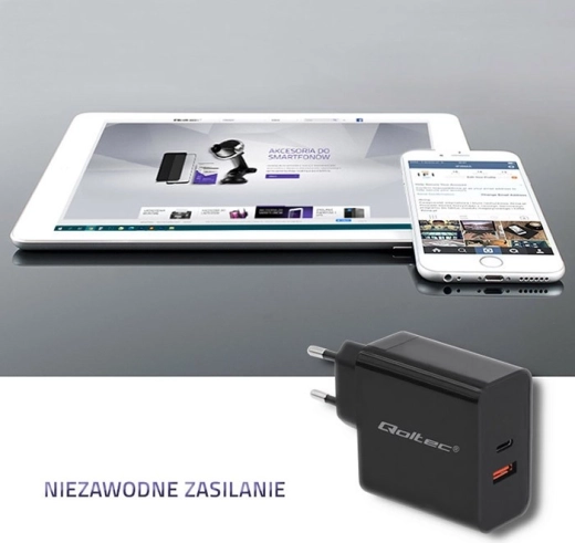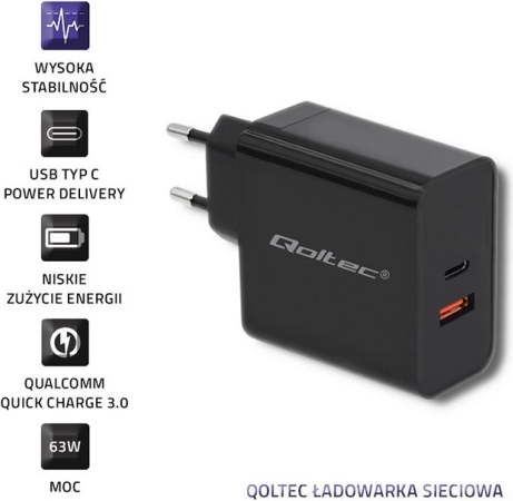 Qoltec-opladeren er udstyret med den nyeste Power Delivery-teknologi, som tilpasser sig den tilsluttede enhed og indstiller optimal spænding og strøm. Takket være USB-C-porten tilbyder den universalitet og en effekt på 63W. Med QUALCOMM QUICK CHARGE forkortes opladningstiden markant i forhold til standardopladere.