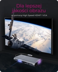 Tilkobl en skærm via HDMI med opløsning op til 4K@30 Hz eller via VGA med opløsning op til 1080p@60 Hz. Ideel til præsentationer og udvidet skrivebord.