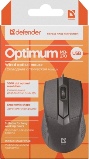 Leder du efter en enkel og pålidelig mus til kontor eller hjemmebrug? DEFENDER Optimum MB-270 med optisk opløsning på 1000 DPI sikrer jævne og præcise markørbevægelser på de fleste overflader. Takket være den kablede forbindelse behøver du ikke tænke på batteriskift eller signaludfald.