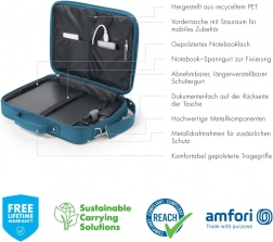 Den praktiske Eco Multi BASE taske med klap beskytter din bærbare optimalt takket være det polstrede laptoprum. Enheder fra 14-15,6" er ikke blot optimalt beskyttet, men også fastgjort i rummet med en elastisk rem. Yderligere stabilitet og beskyttelse sikres af en metaltrådsramme. Som den letteste blandt bærbartasker giver Eco Multi BASE fleksibel mobilitet. I det praktiske frontrum finder du plads nok til din smartphone eller andet mobilt tilbehør som kabler, penne eller opladere, der altid bør være lige ved hånden. Med de behagelige håndtag ligger tasken godt i hånden, og med den integrerede strop kan den på et øjeblik fastgøres til en trolley. Tasken kan også bæres med den justerbare skulderrem, hvilket gør Eco Multi BASE til den ideelle taske for folk, der rejser meget og ønsker at støtte fornuftig genanvendelse af PET-flasker med en miljøvenlig transportløsning.