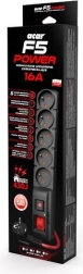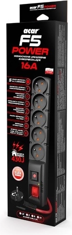 Acar F5 Power er den forstærkede 16 A-udgave af den populære overspændingsliste fra acar-AXON-serien. Med en længde på knap 33 cm tilbyder den fem stik med jord og et effektivt overspændingskredsløb, der leder spidsernes energi til jord via PE-lederen. Praktiske beslag til montering medfølger i pakken.