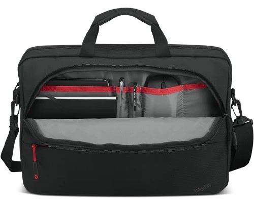 Den praktiske og stilfulde ThinkPad Essential Plus 16 Topload (Eco) tilbyder pålidelig beskyttelse til en 16" bærbar, gennemtænkt organisering af tilbehør og behagelig bæring takket være det polstrede indre, den justerbare rem og den holdbare konstruktion.