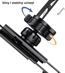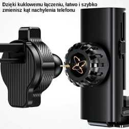 En elegant og funktionel bilholder, som monteres direkte i ventilationsgitteret. Takket være tyngdekrafts-mekanismen er det nok at indsætte telefonen, og armene klemmer automatisk. Den trekantede konstruktion giver høj stabilitet selv ved hårde opbremsninger, så din smartphone forbliver sikkert på plads.
