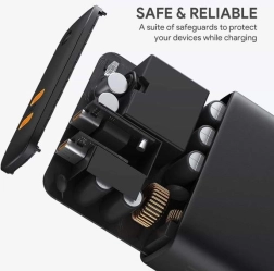 Kompakt og kraftig oplader AUKEY PA-D5 med GaN-teknologi og Power Delivery 3.0 leverer op til 63 W via to USB‑C-porte. Funktionen Dynamic Detect fordeler intelligent effekten mellem enhederne, så du hurtigt kan oplade både telefon og bærbar samtidig, og det sikkert takket være avancerede beskyttelser mod overspænding, overophedning og overladning.