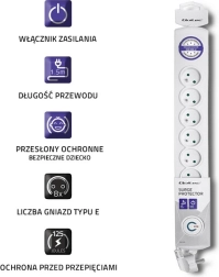 Overspændingsbeskytteren er udstyret med forskellige sikkerhedselementer såsom varistorer til beskyttelse mod høje spændinger, beskyttelseslåger der forhindrer børns adgang til stikkene, og den er fremstillet af flammehæmmende PP-materiale for din sikkerhed.