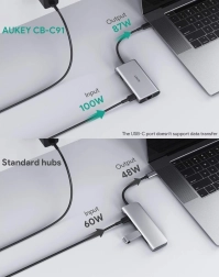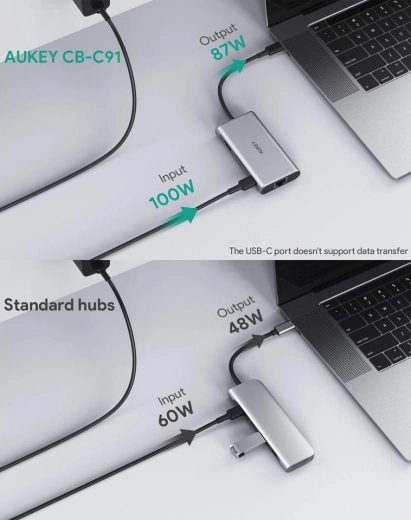 Aukey CB-C91 giver en dataoverførselshastighed på 5 Gb/s, og takket være HDMI-grænsefladen er overførsel af opløsninger op til 4K @ 30 Hz til den tilsluttede skærm intet problem. Den gigabit Ethernet-port understøtter desuden netværkshastigheder op til 1.000 Mb/s. Du kan også uden problemer oplade dine yndlingsenheder. Ved hjælp af Power Delivery-teknologi kan din bærbare computer forsynes med op til 100 W effekt, selv når du bruger hubbens øvrige funktioner. Opladning har aldrig været så hurtig; du vil vænne dig til denne høje driftsstandard fra dag ét, og Aukey CB-C91 vil blive en uvurderlig (og uundværlig!) støtte for dig.
