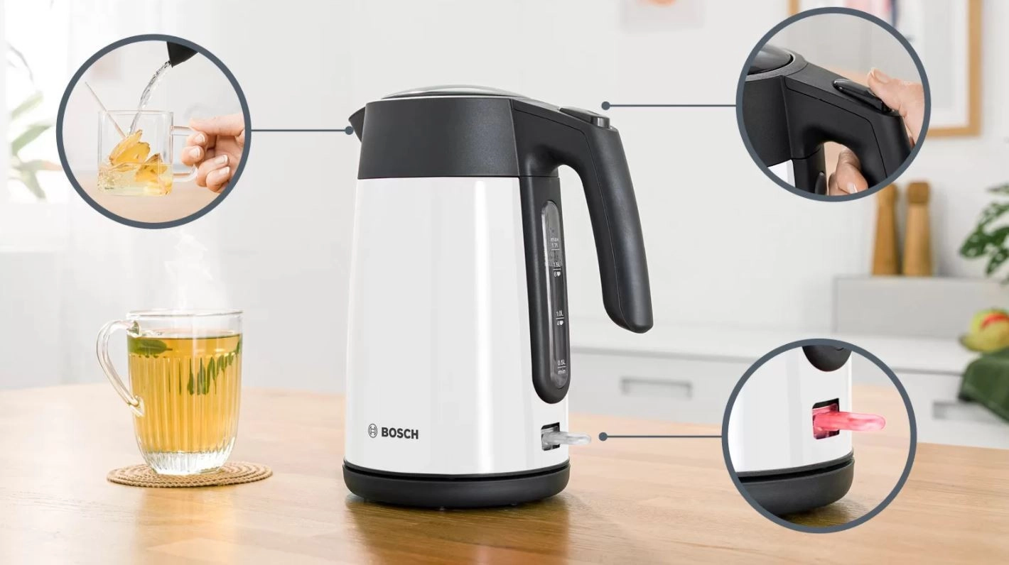 Kog vand hurtigt, sikkert og energieffektivt. BOSCH-kedlen 1,7 l kombinerer pålidelig ydelse med praktiske detaljer til hverdagskomfort: én-kops indikatoren minimerer forbrug, den formede tud sikrer ren ophældning uden dryp, og låget, der åbnes med et tryk, gør påfyldning og rengøring enkel.