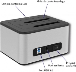 Leder du efter en hurtig og bekvem måde at håndtere store datamængder, sikkerhedskopiere eller migrere systemet? Denne dokningsstation tilbyder to slots til HDD/SSD, top overførselshastighed via USB 3.0 (op til 5 Gbps) og pålidelig kompatibilitet med SATA I/II/III. Takket være Plug & Play er det blot at tilslutte og bruge med det samme – uden installation.