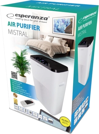 Esperanza luftrenser bruger et avanceret 5-trins filter, som effektivt fanger forskellige typer forurening og hjælper med at skabe et sundt hjemmemiljø. Den integrerede meget følsomme sensor registrerer svævende støv PM2,5, så du altid ved, hvilken luftkvalitet der er i dit rum.