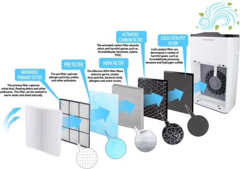 - 5-trins: basisfilter, forfilter, aktivt kul, HEPA (H11), kold katalytisk filter