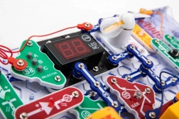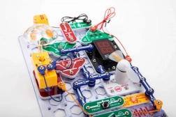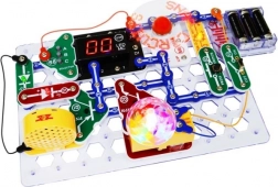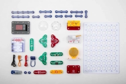 - 1× plade, 35× komponenter (fx fly, mini-bil, højttaler, bevægelsesdetektor, motor med gear), 1× manual (til download online)