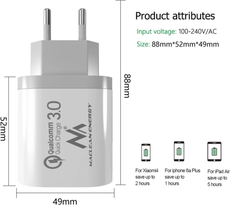 Maclean Energy-opladeren lader dig oplade op til 3 enheder på samme tid via tre USB-porte. Den indbyggede modul genkender automatisk den tilsluttede enhed og oplader den med maksimal og passende strøm. Det sikrer kortest mulige opladningstid.