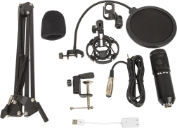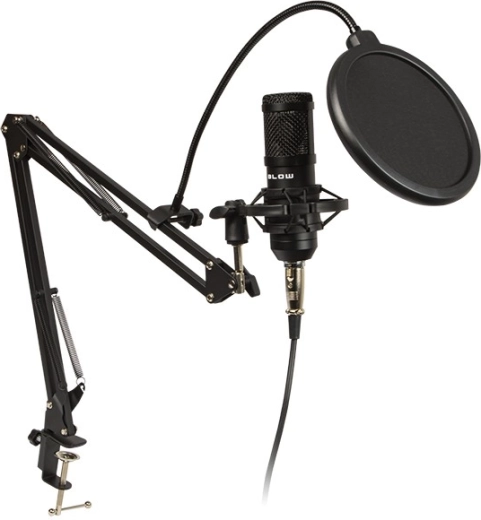 Højkvalitets studie mikrofon fra mærket Blow med komplet tilbehør gør det muligt for øjeblikkelig brug. Mikrofonen med USB-tilslutning er ideel til optagelse af lyd på computer eller laptop, streaming og andre formål.