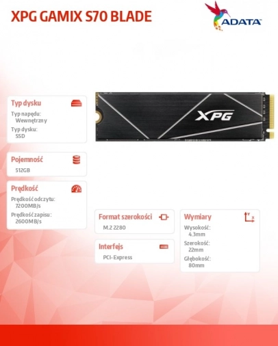 Ultrahurtigt internt NVMe-drev XPG GAMMIX S70 BLADE med PCIe 4.0 x4 leverer ydeevne op til 7,2/2,6 GB/s. Det kompakte M.2 2280-format og en aluminiums-køleplade sænker temperaturen med op til 20 %. Takket være LDPC ECC, E2E-databeskyttelse, RAID Engine og AES-256 får du hastighed, pålidelighed og sikkerhed.