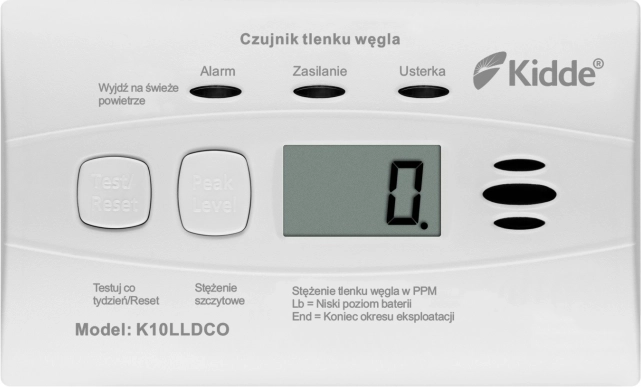 Kulilte-detektoren Kidde K10LLDCO med indbygget LCD-display viser CO-koncentration i området 0 til 999 PPM. Takket være strøm fra det indbyggede batteri kan detektoren installeres det optimale sted uden afhængighed af netspænding.