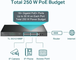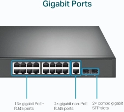 Denne switch tilbyder 16 gigabit-porte med PoE+-understøttelse, 2 gigabit RJ45-porte og 2 gigabit SFP combo-porte for maksimal tilslutningsfleksibilitet.