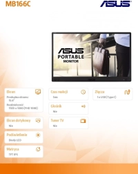 ASUS ZenScreen MB166C er en let og bærbar 15,6" Full HD skærm, ideel til professionelle på farten. Den tilbyder brede betragtningsvinkler, mat display minimerer genskær og takket være IPS-teknologi giver den konsistente farver.