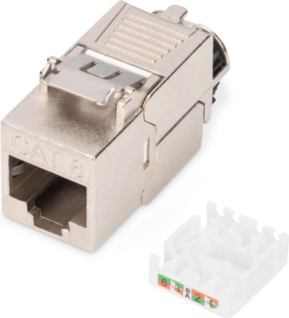 Professionelt RJ45 Keystone-modul Cat 8.1 med 360° skærmning (STP) og værktøjsfri installation til de højeste netværkshastigheder. Understøtter 25/40 GBase‑T, frekvens op til 2000 MHz og er ideelt til ToR/MoR i datacentre samt moderne struktureret bygningskabling.