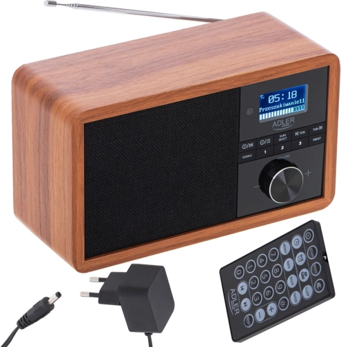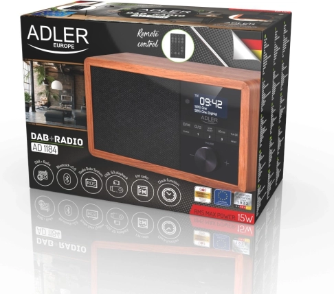 I en tid med teknologisk udvikling forventer vi nye løsninger, også når det gælder radiomodtagere. Uanset om vi er hjemme eller på arbejde, vil vi gerne have musik eller yndlingsradioprogrammer ved hånden for at få tiden til at gå. Anvendelsen af Bluetooth-teknologi i AD 1184-radioen muliggør trådløs tilslutning til enheden, hvorfra du afspiller musik, hvad enten det er en smartphone, tablet eller computer. Det elegante design og træhuset gør, at radioen passer ind i enhver indretning. Radioen modtager udsendelser på FM-, AM- og DAB+-båndene. Enheden er udstyret med et letlæseligt LCD-display. Radioen har indbygget ur og alarmfunktion. Radioen giver os mulighed for at lytte til yndlingsudsendelser på FM- og AM-båndene samt DAB+. Det er en meget nyttig kombination af flere funktioner. Højttalerne på 3 W leverer en klar og tydelig lyd. Og stationshukommelsen gør det nemt at gemme dine foretrukne og ofte lyttede stationer. LCD-displayet gør det nemt at betjene enheden og er en interessant detalje i træhuset.