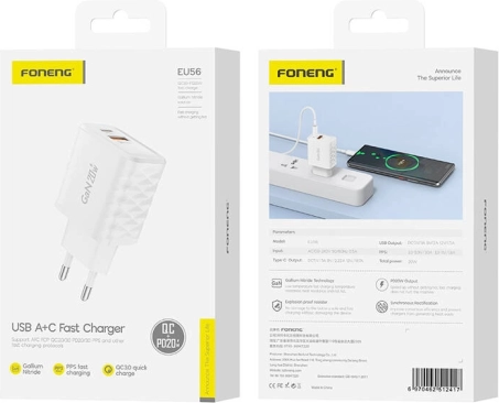 Foneng EU56 oplader 20W med USB-A og USB-C til hurtig og sikker opladning. Kompatibel med flere protokoller.
