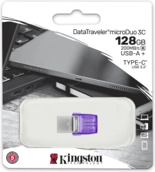 Det kompakte USB-flashdrev Kingston DataTraveler microDuo 3C tilbyder en kapacitet på 128 GB, dobbelt interface USB‑C og USB‑A og hurtige overførsler takket være USB 3.2 Gen 1 med læsehastighed op til 200 MB/s. Ideelt til at frigøre plads på telefon eller tablet, nem sikkerhedskopiering og overførsel af fotos og videoer. Understøttelse af OTG og plug and play betyder øjeblikkelig brug uden installation.