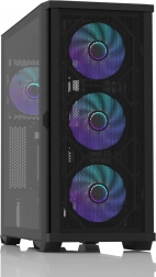Kabinettet er optimeret til maksimal luftgennemstrømning – mesh-paneler og gennemtænkt ventilation fremskynder varmeafledningen fra komponenterne. Understøttelse af adresserbar RGB-synkronisering og den medfølgende ARGB-splitter 1-til-2 forenkler kabelføringen og udvidelse af belysningen.
