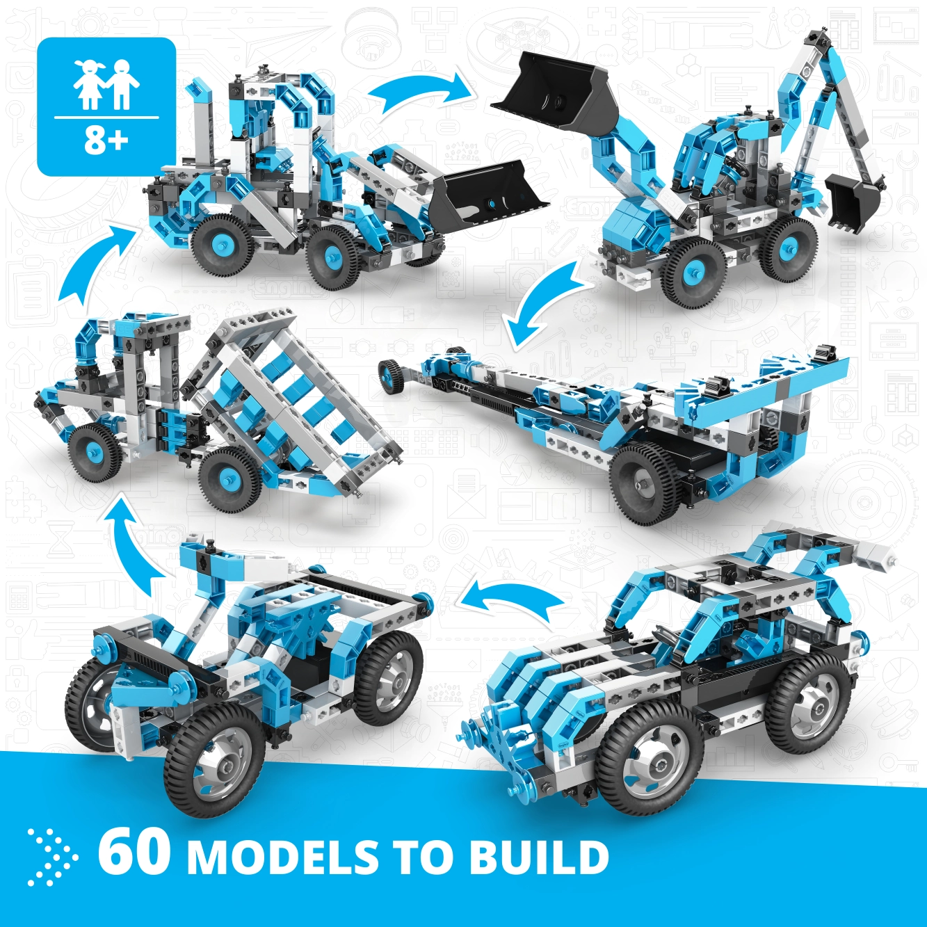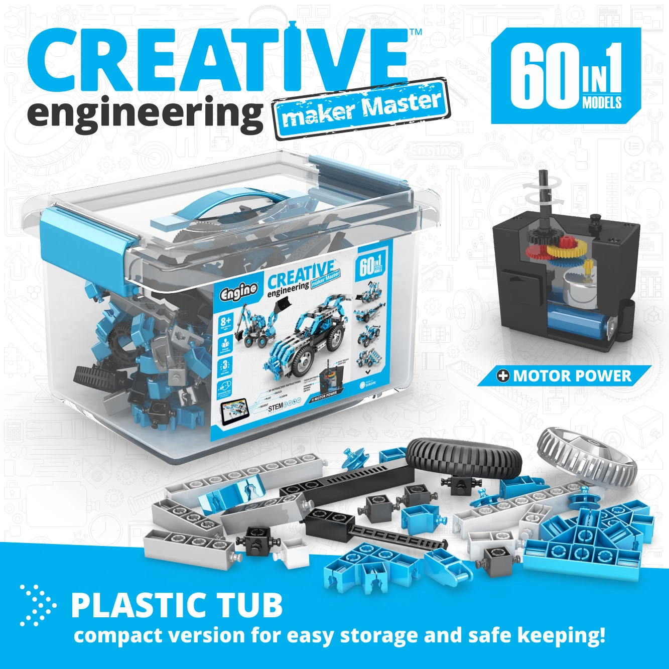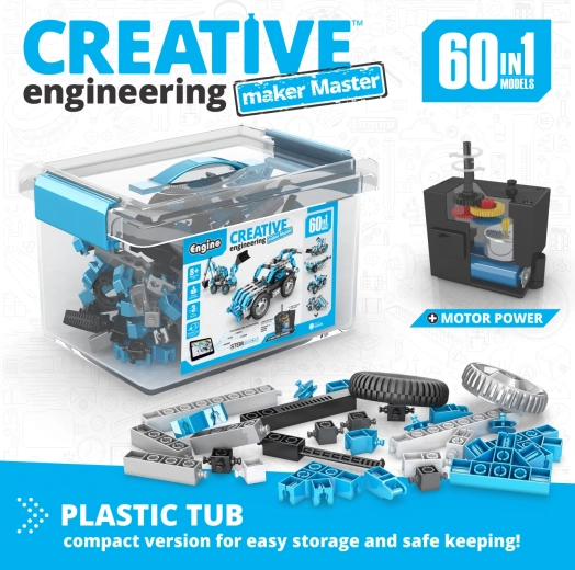 Byggesættet ENGINO Motorized Maker 60 i 1 er et ideelt valg til børn fra 8 år, der elsker teknik og kreativitet. Farvede vejledninger (delvist trykte, delvist online eller i den gratis 3D-app) guider dig gennem opbygningen af dusinvis af modeller. Delene klikkes nemt sammen, og hele sættet er opbevaret i en praktisk plastkuffert for nem transport og opbevaring.