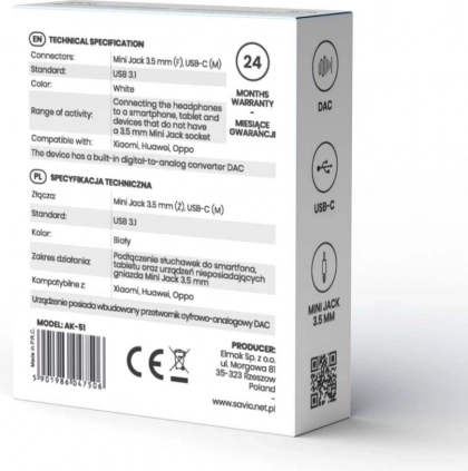 USB‑C til 3,5 mm jack lydadapter med DAC SAVIO