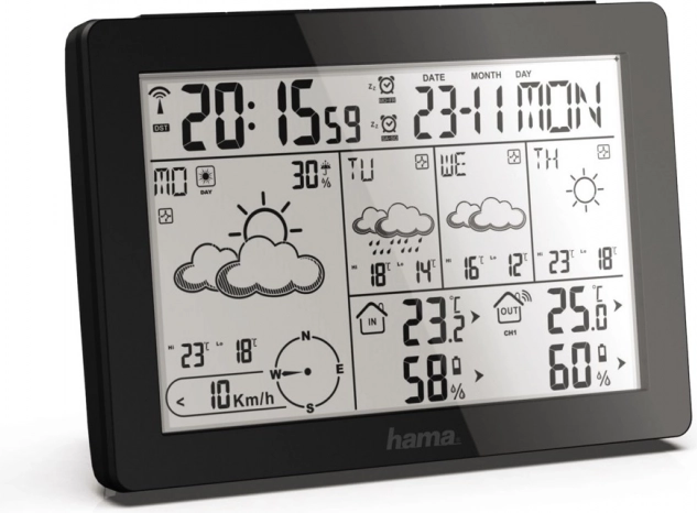- Digital visning af temperatur, tid, professionelle vejrudsigter og luftfugtighed samt sandsynlighed for regn, vindhastighed og -retning