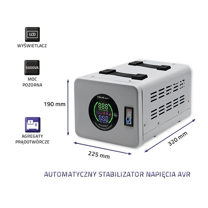 Har du brug for pålidelig strøm til værktøj, kompressorer, pumper eller udstyr i en foodtruck eller campingvogn? Den automatiske spændingsstabilisator QOLTEC AVR 5000 VA udligner netsvingninger og beskytter følsom elektronik. Den stabiliserer indgangen til sikre 230 V, eliminerer spikes og frakobler belastningen ved for høj spænding for at forebygge skader.