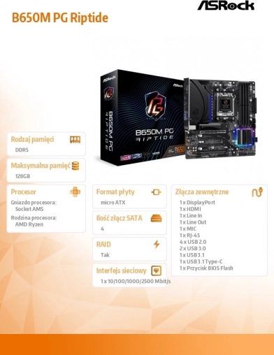 ASRock B650M PG Riptide er et kraftfuldt microATX-bundkort til AM5-platformen, ideelt til både gaming- og creator-builds. Det tilbyder understøttelse af AMD Ryzen 7000-processorer, hurtig DDR5-hukommelse, PCIe 5.0 M.2 til lynhurtig lagerplads og omfattende USB-tilslutning. Robust strømforsyning 12+2+1 med Dr.MOS, kvalitetslyd fra Nahimic og HDMI/DisplayPort-udgange gør det til et fremragende fundament for en moderne PC.