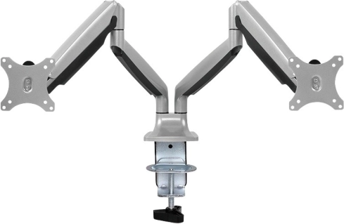 Det dobbelte skærmarm-system lader dig tilpasse højden, hældningen og rotationen på begge skærme for at opnå den ideelle betragtningsvinkel. Den robuste konstruktion sikrer stabilitet, mens bordklemmen sparer værdifuld plads på bordpladen.