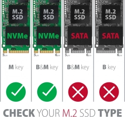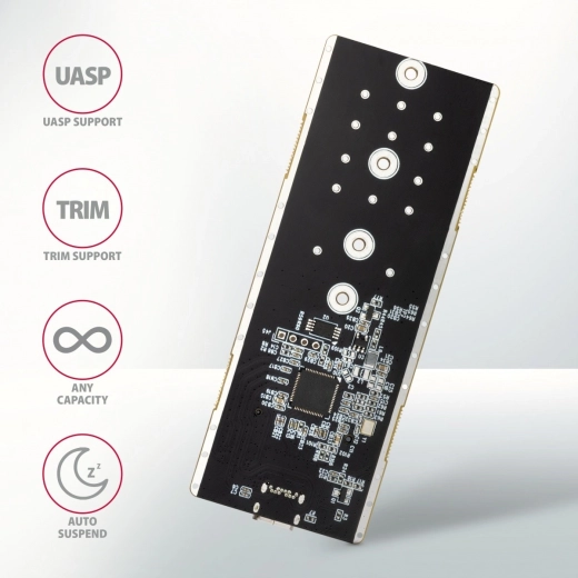 Kabinettet er udstyret med ribber og termiske pads, som effektivt køler den indsatte M.2 SSD og øger dens levetid. Kabinettet beskytter SSD’en fra siderne, med overophedningsbeskyttelse, der reducerer risikoen for “Thermal Throttling”.