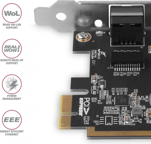 Kortet understøtter Plug & Play, hardwareaccelerationer (Checksum Offload, Large Send), Full Duplex med flowkontrol, VLAN-tagging samt trafikprioritering (802.1P). Auto MDI/MDIX sikrer automatisk registrering af krydsede kabler, LED-indikatorer viser aktivitet, og moderne Wake‑on‑LAN-scenarier muliggør fjernopvågning.