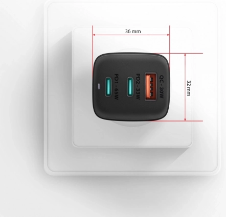 Den kompakte rejseoplader AXAGON GaN 65W oplader hurtigt op til tre enheder samtidig. Takket være GaN-teknologi tilbyder den høj effekt i et lille kabinet, to USB-C-porte med Power Delivery 3.0/QC 4+ og én USB-A med QC 3.0. Understøtter PPS, Samsung SFC/SFC 2.0 samt Apple PD 20–27W og kan også forsyne bærbare computere op til 65W.