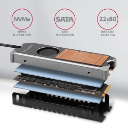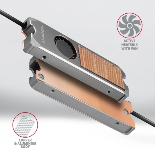 Den aktive køler til M.2 2280 SSD kombinerer en ribbet kerne i kobber og et aluminiumscover med en lydsvag blæser styret via PWM. Tilslutning til en standard 4-pin header muliggør automatisk regulering efter temperaturen. Takket være metalrammen ledes varmen væk fra begge sider af drevet, hvilket maksimerer køleydelsen for NVMe og SATA (AHCI)-moduler.