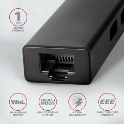 Det integrerede netværkskort giver en pålidelig og hurtig kablet forbindelse, støtte for avancerede funktioner (VLAN, jumbo frames, checksum offload, Wake‑on‑LAN m.m.) og nem installation i Windows 8.1 og nyere uden behov for internet. Det kompakte aluminiumskabinet med fin tekstur modstår fingeraftryk, og takket være 20 cm kabel er hubben perfekt på farten – den fungerer også med udvalgte telefoner og tablets med USB‑C/Android.