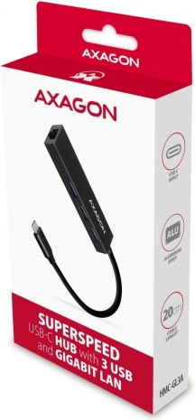 Den elegante og robuste flerportshub AXAGON HMC-GL3A er et fremragende tilbehør til ultrabooks og moderne bærbare med USB-C. Du får tre hurtige USB-A-porte til periferiudstyr og eksterne drev samt en stabil Gigabit LAN til arbejde og underholdning. Takket være USB 3.2 Gen 1 (USB 3.0) klarer den overførsler op til 5 Gb/s og håndterer uden problemer flere eksterne drev samtidigt.