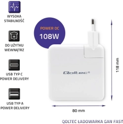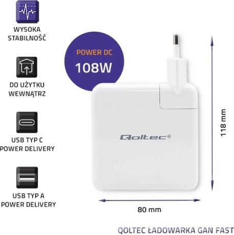 Qoltec-opladeren GaN FAST 108W repræsenterer en revolution inden for opladningsteknologi takket være innovativ brug af halvledermaterialet GaN. Denne teknologi sikrer, at opladeren ikke kun er kraftfuld og hurtig, men også lettere end traditionelle modeller.