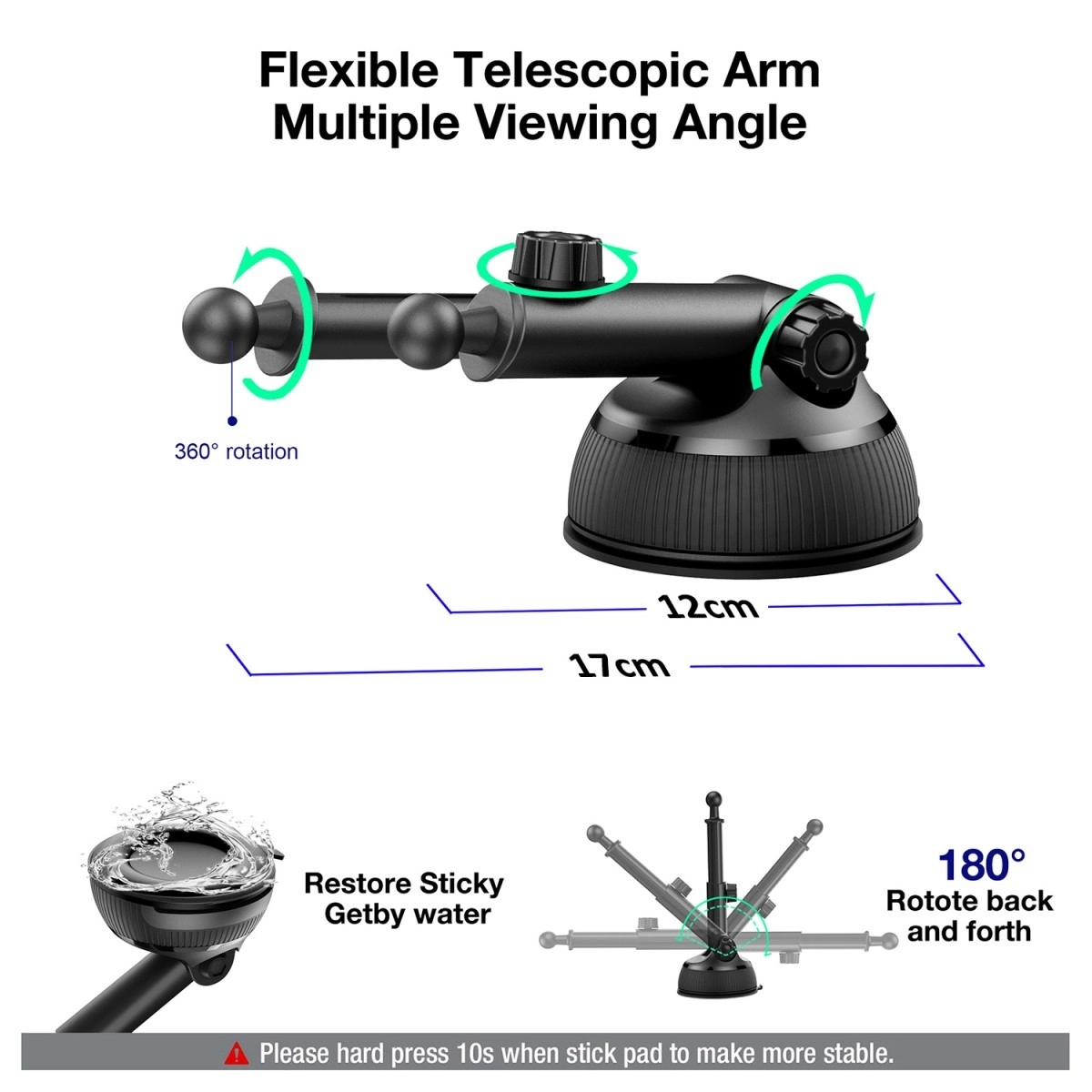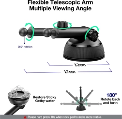 Installationen er enkel og universel: vælg sugekop til forrude eller instrumentbræt eller clips til ventilationsrist. Kulekoblinger muliggør 360° rotation for perfekt synsvinkel under navigation og håndfri opkald. En indbygget kondensator holder armfunktionen aktiv selv efter strømafbrydelse, så du kan tage telefonen ud uden stress.