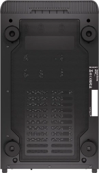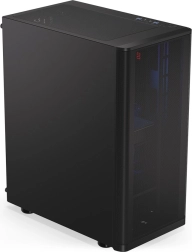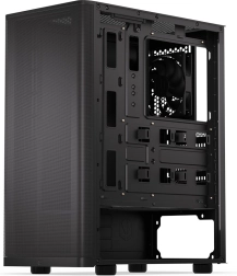 Mål 373 × 440 × 211 mm med plads til ATX-motherboards og lagring: 3× 2,5" eller 1× 3,5" + 2× 2,5". En sideplade i stål beskytter komponenterne og giver et elegant look.