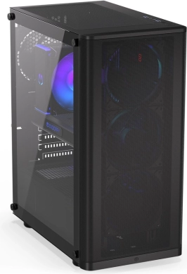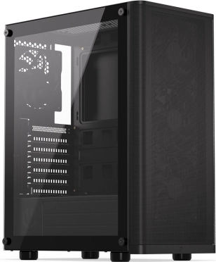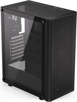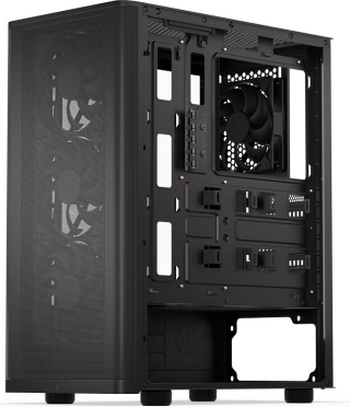 Sidepanelet af hærdet glas præsenterer komponenterne elegant, og kabinettes solide konstruktion giver plads til kraftige builds. Du kan uden problemer installere et ATX-bundkort, op til 3× 2,5" lagringsenheder (eller 1× 3,5" + 2× 2,5") samt store luftkølere eller vandkøling med radiatorer på 360 mm (front) og 240 mm (top).